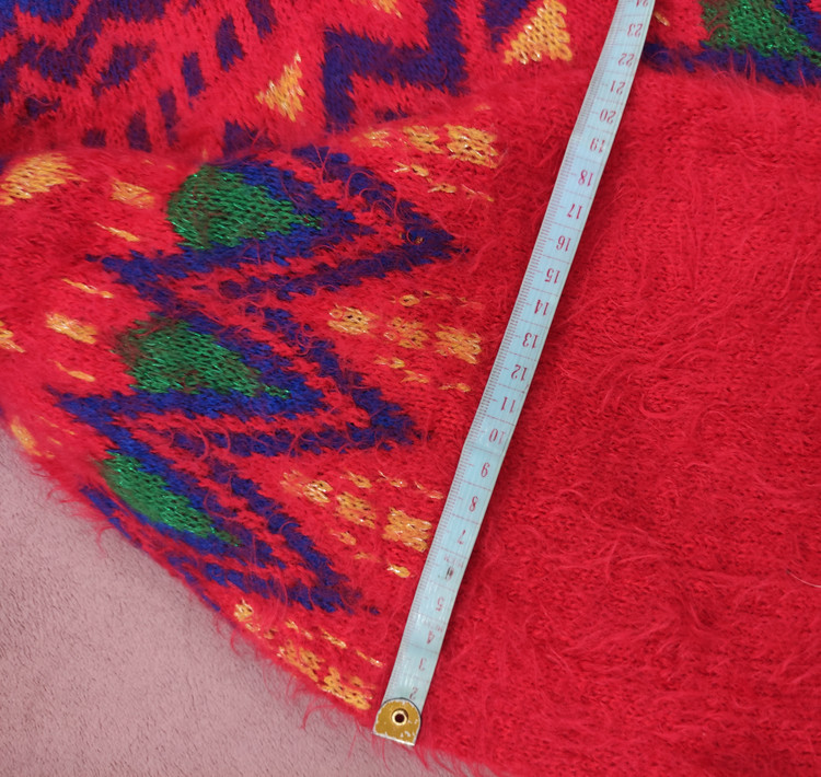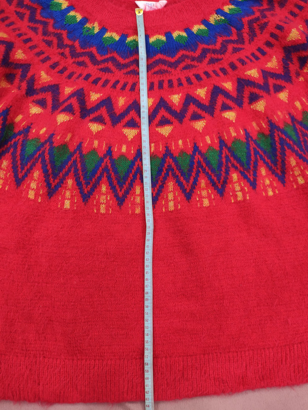 سایز: قد بافت از یقه تا پایین 63سانتی متر/عرض زیر بغل 66-65سانتی متر/دور بازو 21سانتی متر/